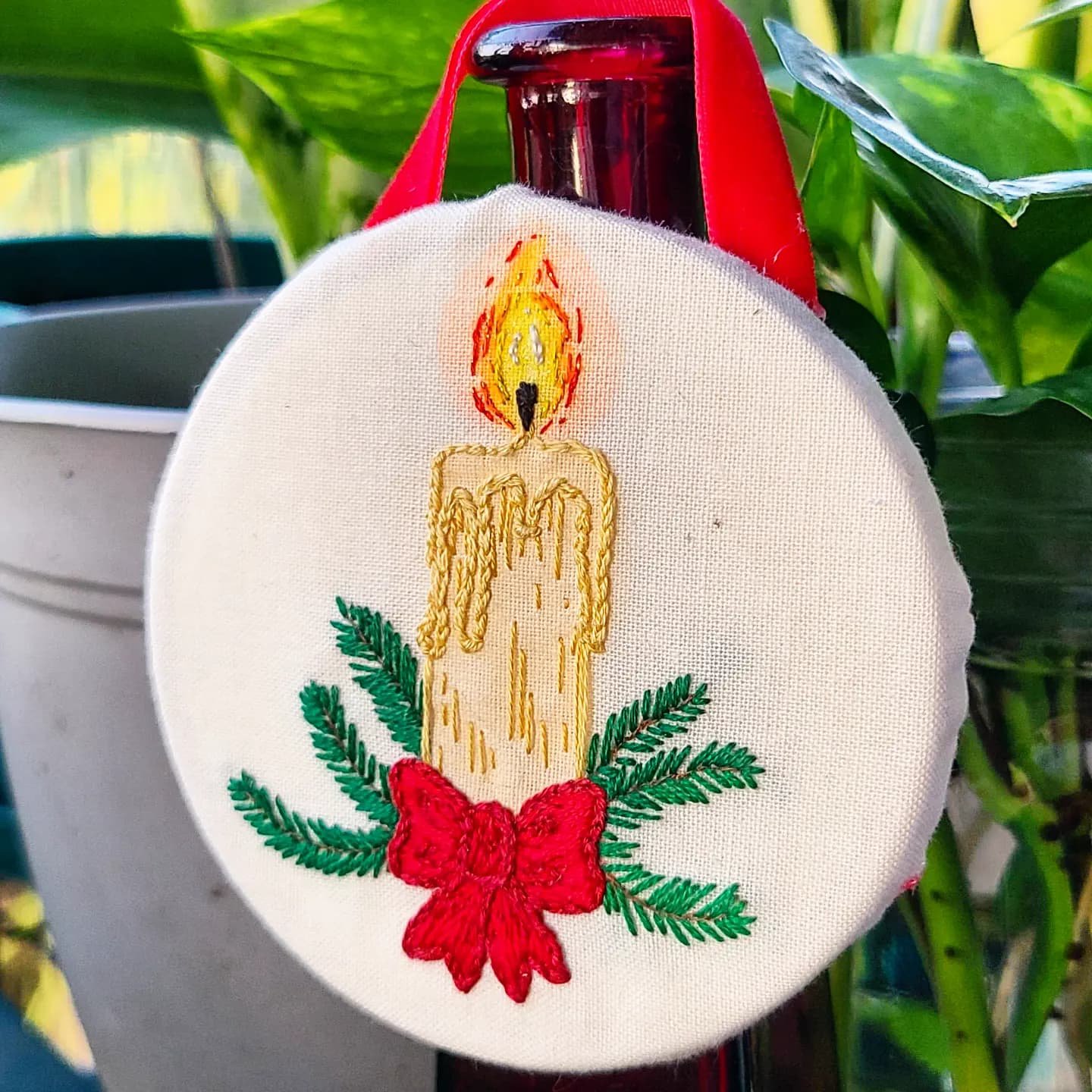 Christmas candle burning through the night. DMC, anchor, and etoile thread, watercolor, cotton, velvet ribbon.